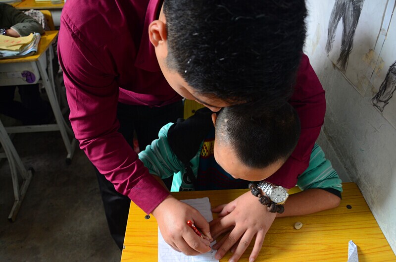 在和這些孩子們的接觸過(guò)程中,我們發(fā)現(xiàn),雖然他們的生活條件不是太好,自身或多或少的有些殘疾,但這些孩子并沒有我們之前所想象的那樣孤僻,反而是個(gè)個(gè)面帶著燦爛的笑臉,保持著積極樂觀的生活態(tài)度。這些孩子中有的畫畫的很好,有的字寫的很漂亮,還有的孩子興高采烈地拉著我的手讓我給他照相……我們所有人都融入到這群孩子當(dāng)中,教給他們寫字,和他們一起玩耍、做游戲,而他們也教會(huì)了我們不管生活有多艱苦,都應(yīng)該報(bào)以一顆感恩的心去勇敢地面對(duì)生活。