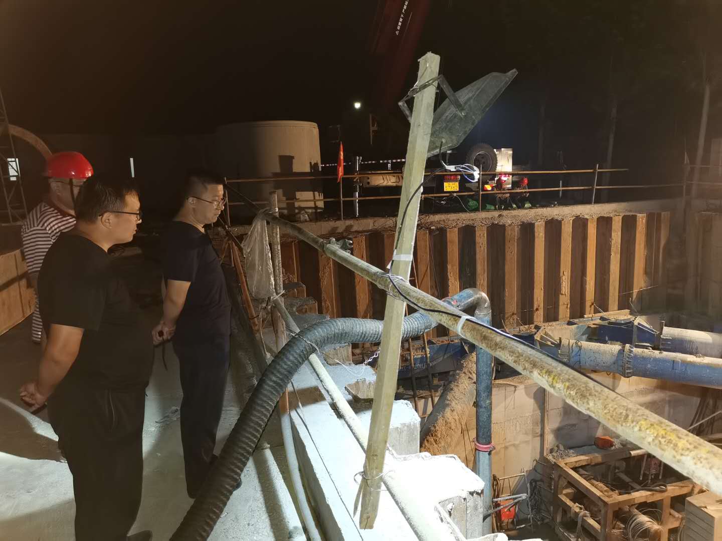 鄧剛先后視察了管網(wǎng)施工第六標段、頂管過地表水超采、頂管過火頭灣大橋、頂管過S321公路等5處頂管施工現(xiàn)場。時至23:40分,在頂管過南躍進溝工作井施工現(xiàn)場,數(shù)名施工人員挑燈夜戰(zhàn),正進行頂管軌道焊接安裝和設備調試工作,夜燈下的身影在工地上來往奔波,現(xiàn)場到處是搶抓工期的干勁與熱情。